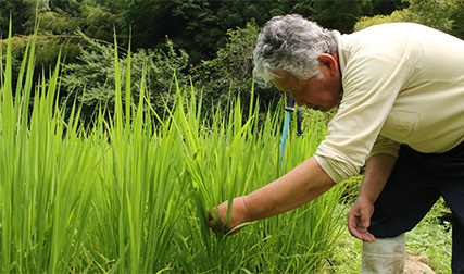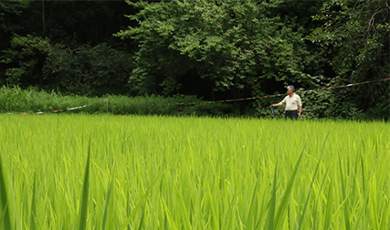 当館では小境の里山からわき出す清水をそのまま利用した水田で丹精込めてコシヒカリを作っています。清らかな美しい水で作られたお米を、ご飯だけでなく、お酒に。原材料になるお米は、小境の豊かな郷土から作られています。